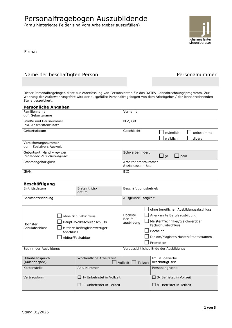 Downloads Personalfragebogen PDF-Download Personalfragebogen geringfügig Beschäftigte PDF-Download Personalfragebogen für Auszubildende PDF-Download Sofortmeldung PDF-Download Vollmacht zur Vertretung in Steuersachen PDF-Download Befreiungsantrag Rentenversicherung PDF-Download Vollmacht zur Einsichtnahme in ein Steuerkonto PDF-Download Einzugs-Ermächtigung Finanzamt NRW PDF-Download Vorlage zur Dokumentation der täglichen Arbeitszeit PDF-Download